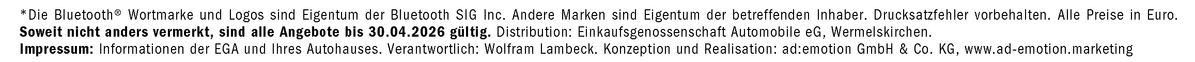 ** Die angegebenen Werte wurden nach dem vorgeschriebenen Messverfahren (WLTP) ermittelt. Die Angaben beziehen sich nicht auf ein einzelnes Fahrzeug und sind nicht Bestandteil des Angebots. Sie dienen allein Vergleichszwecken zwischen verschiedenen Fahrzeugtypen. Der tatsächliche Kraftstoffverbrauch und die CO₂-Emissionen eines Fahrzeugs hängen nicht nur von der effizienten Ausnutzung des Kraftstoffs durch das Fahrzeug, sondern auch vom Fahrstil, den Straßenverhältnissen und anderen nichttechnischen Faktoren ab. CO2 ist das für die Erderwärmung hauptsächlich verantwortliche Treibhausgas. Weitere Informationen zum offiziellen Kraftstoffverbrauch und den offiziellen spezifischen CO2-Emissionen neuer Personenkraftwagen können dem 'Leitfaden über den Kraftstoffverbrauch, die CO2-Emissionen und den Stromverbrauch neuer Personenkraftwagen' entnommen werden, der an allen Verkaufsstellen und bei http://www.dat.de unentgeltlich erhältlich ist. Für weitere Informationen siehe Pkw - Energieverbrauchskennzeichnungsverordnung – Pkw-EnVKV.